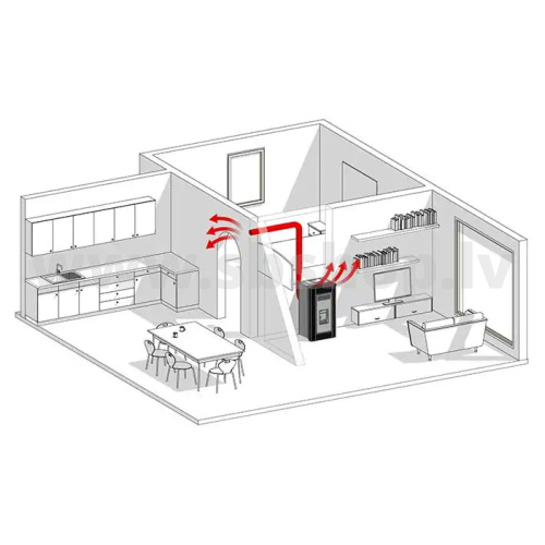 Marisa ir granulu kamīns ar jaudu 9,2 kW ar gaisa plūsmu uz divām istabām. Ierīcei ir 2 neatkarīgi ventilatori - viens silda telpu, kurā uzstādīta krāsns, bet otrs neatkarīgais ventilators ar izvadu aizmugurē ļauj sadalīt karsto gaisu pa apkures kanālu uz otru telpu. Tas ir ideāls risinājums, kas ļauj efektīvi un pilnībā kontrolēt apsildi vismaz divās telpās vienlaikus.